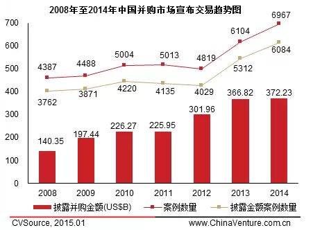 根据CVSource投中数据终端显示,2014年中国并购市场宣布交易案例达6967起,宣布交易规模3722.27亿美元,数量及金额较2013年同比分别增长14.14%、1.47%;完成