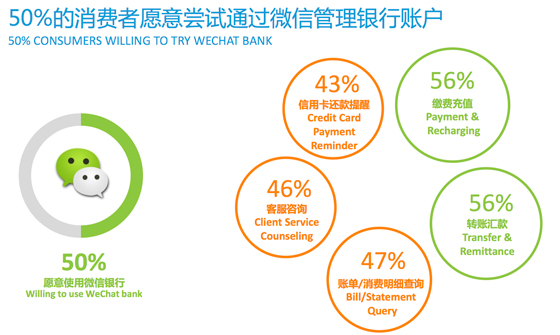 作为中国最为普及的通讯应用之一,微信在互联网金融平台上同样占据了重要位置。在超过半数的受访者中,缴费充值(56%)、转账汇款(56%)、账单明细查询(47%)、客服咨询(46%)和信用卡还款提醒(43%)是消费者最希望通过微信实现的账户管理功能。