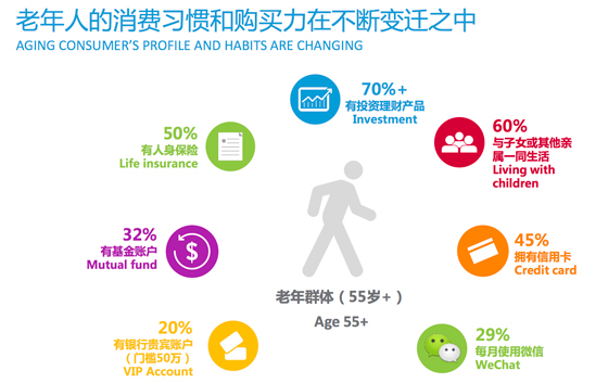 尼尔森调研发现,老年人退休前所处的时代背景和消费习惯直接影响了他们进入老年后的消费能力和投资理财观点。在城市受访的55岁以上老年人中,70%以上有投资理财产品,半数老年人拥有人身保险,45%持有信用卡,约五分之一的老年人有银行贵宾帐户(拥有至少50万元人民币的银行存款),近三成老年人会使用微信与人交流。
