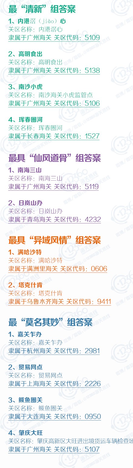 “神经小编”夜查“关区代码表”发现,许多关区简称神妙莫测,有的“萌萌”的、有的“DuangDuang”的,还有不查字典还真不敢念的。海关监管点的分布反映了国家改革开放的布局,大家一起来猜猜这些简称属于哪个关区吧!