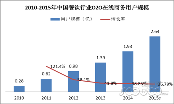 餐饮行业可以说是与人们日常生活联系最紧密的行业之一,随着移动互联网产业与在线支付功能的普及,越来越多的用户开始尝试在线预订或者外卖,消费模式的改变让用户也快速的增长。2014年中国餐饮行业O2O在线商务用户规模达到1.93亿,较2013年增长38.85%;2015年中国餐饮O2O在线市场规模将达到2.64亿,比2014年增长36.79。随着一线城市在线商务用户增长逐步放缓,其用户规模增长率将随之下降,趋于平稳化发展。