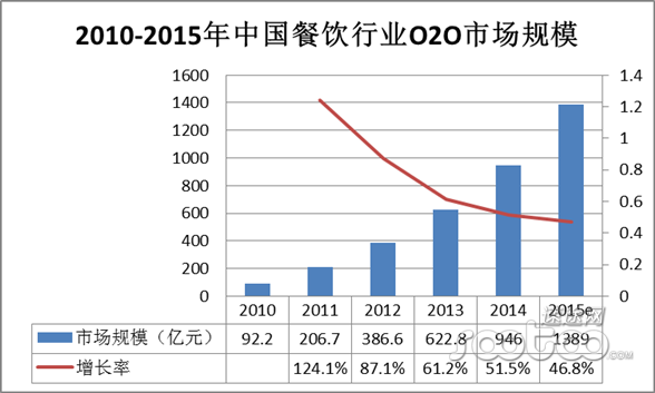 都说民以食为天,吃可以说是人生活一天所必须的环节,而其带来的市场潜力与规模更为巨大。从2013年开始移动互联网高速发展为在线餐饮市场的迅速发展奠定了坚实的基础,到2014年在线外卖更是成为餐饮O2O中发展最为快速的产品迅速崛起。根据数据显示,2014年中国餐饮行业O2O市场规模达到946亿元,相比2013年增长51.5%;预计2015年中国餐饮行业O2O市场规模在2014年的基础上将增长到1389亿元。要知道2010年餐饮O2O市场规模仅为92.2亿元,经过5年的发展其规模翻了10倍。这些都与移动互联网的爆发式增长、移动支付习惯的养成有着密不可分的关系,正是这些多种因素才造就了其庞大的市场规模。