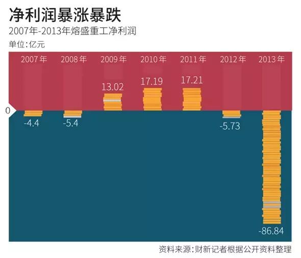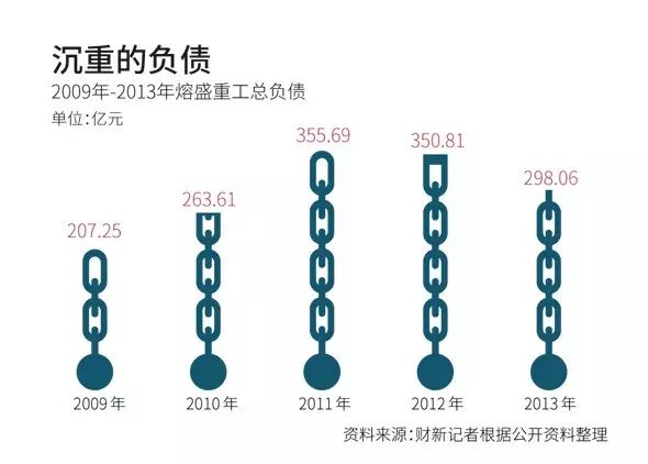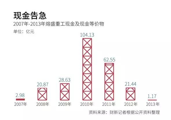 根据熔盛重工2013年年报,因大额拨备,当年亏损86.84亿元,存货周转日上升到254天,经营活动所产生的现金流量净额为-32亿元,年终现金及现金等价物仅有1.17亿元,负债规模达到298亿元。