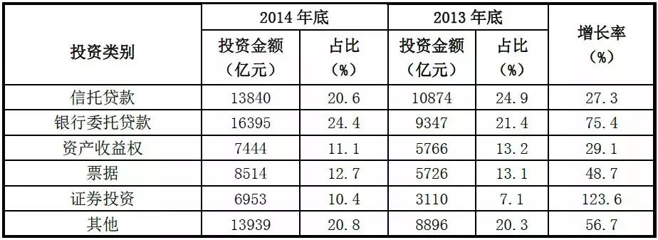 从最终投向看,定向通道业务主要投向一般工商企业、房地产、基础产业及地方融资平台,截至2014年底,投资规模分别为1.2万亿元、8970亿元、6515亿元及4999亿元。