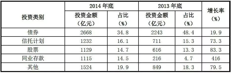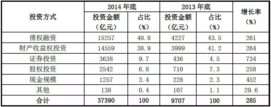 基金子公司专户以融资业务为主,在方式上主要采用债权融资和财产收益权融资,截至2014年底,债权融资和财产收益权融资规模分别为1.53万亿元、1.46万亿元,分别占比40.8%、38.9%;证券投资规模3638亿元,占比9.7%;股权投资规模2542亿元(基金子公司专户股权投资规模中的大部分是“明股实债”。),占比6.8%;现金资产规模1257亿元,占比3.4%;另外还有138亿元其他类投资。其中,证券投资规模较2013年底增长734%,占比上升5.2个百分点;而债权融资、财产收益权融资规模较2013年底分别下降2.7个百分点、2.3个百分点。