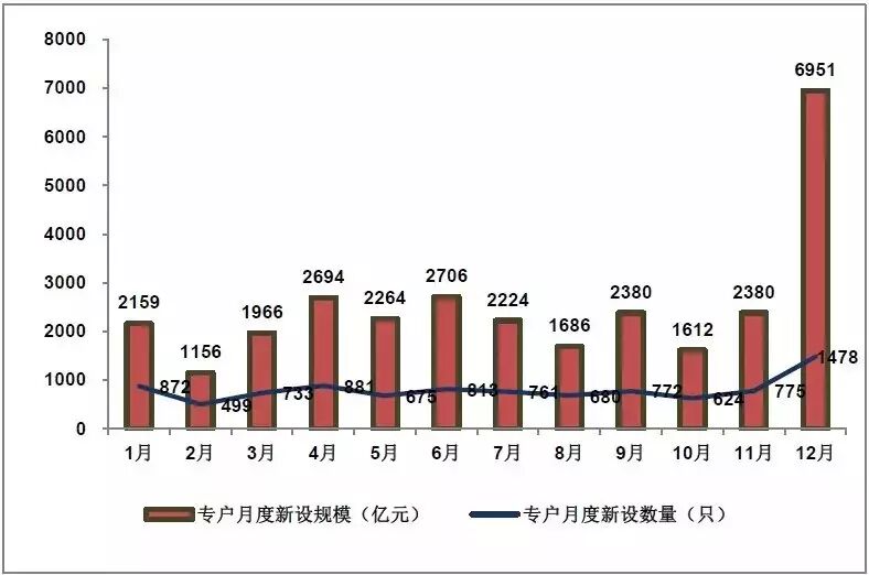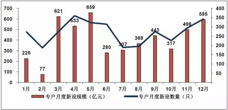 2014年,基金子公司专户业务新设产品9563只, 新设规模3.02万亿元,月均新设规模2514亿元。新设一对一产品规模1.78万亿元,占比59%,新设一对多产品1.24万亿元,占比41%。下半年,基金子公司加强了房地产、地方融资平台等领域融资项目的风控管理,新设规模略有下降,年末受多种因素影响新设规模出现飙升。