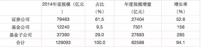 截至2014年底,证券公司资管业务、基金公司及其子公司专户业务管理资产总规模12.91万亿元,较2013年底增加6.26万亿元,增长94%。其中,证券公司资管业务管理资产规模7.95万亿元,较2013年底增加2.74万亿元,增长53%;基金公司专户业务管理资产规模1.22万亿元,较2013年底增加7501亿元,增长158%;基金子公司专户业务管理资产规模3.74万亿元,较2013年底增加2.77万亿元,增长285%。