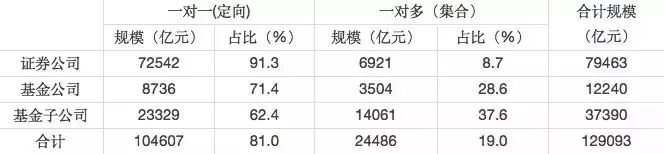 从产品类型来看,截至2014年底,一对一专户存续产品1110只,管理资产规模8736亿元,占比71.4%,较2013年底增加5107亿元,增长141%;一对多专户存续产品1994只,管理资产规模3504亿元,占比28.6%,较2013年底增加2394亿元,增长216%。