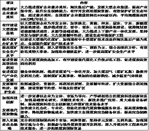 形成10个亿吨级、10个5000万吨级大型煤炭企业,煤炭产量占全国总产量60%以上。 |
