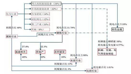 通过对煤炭消费去向的跟踪,直接需求主要为电力耗煤48%,钢铁耗煤17%,水泥耗煤13%,化肥耗煤3%,其他耗煤19%。中游制造业主要是钢铁、水泥,其对煤炭的需求占比分别为22.7%和14.4%;终端下游行业主要是房地产、基建,其对煤炭的间接拉动作用最大,折合耗煤量占比分别为9.38%、11.98%。