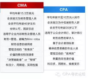 注册会计师简称CPA(CertifiedPublicAccount)是中国的一项执业资格考试。从1991年开始实行的注册会计全国统一考试制度,1993年起每年举行一次。而美国注册管理会计师(CMA)系全球权威的管理会计组织美国管理会计师协会(IMA)旗下的权威专业认证资格,始于1919年,全球8万会员,遍及180个国家。从建制时间上来讲比中国的注册会计师CPA早了70多年。然而,不幸的是,这起先进的权威的适用的国际财务认证CMA真正被国资委、国家外国专家局引进中国是在2009年。于是,CICPA基于得天独厚的历史条件被中国99%的财务会计所认识。学会计、考CPA、进“四大”,一直是传统财会人士一成不变的思想,造成了CPA在传统财务人士心中暂时不可撼动的位置,再加上很多传统财务人士对CMA的首次认知度不够,也极大的局限了职业规划思路。