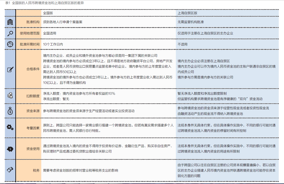 双向流通。目前跨境人民币双向资金池与外币双向资金池都可以在全国范围内开展。一是人民币双向资金池。其最早是在上海自贸区内实施。区内公司可以作为境内人民币资金池的主账户,通过人民币委托贷款的框架搭建一个主账户和子账户的金字塔型的资金池,实现每日资金归集。在此基础上,自贸区的公司和境外关联公司之间搭建一对一的人民币跨境双向资金池,实现人民币跨境双向资金流动。不过,参与资金池的资金来源必须是企业集团内部经营活动或投资活动所产生的自有资金,通过外部融资方式获得的资金不能参与跨境双向资金池。目前,人民币跨境双向资金池已向全国放开。2014年11月人民银行颁布相应的实施细则。全国版的人民币跨境资金池和上海自贸区版的差异可参见本文表1。目前,上海自贸区版的跨境人民币资金池,从政策宽松程度上来说还具备相当的优势。随着2015年上海自贸区的扩容,想必会有更多企业被惠及。跨国公司可以根据自身条件选择更为合适的资金池方案。二是外币双向资金池。根据外汇局的规定,申请方的货物贸易分类须为“A”,且近三年无重大外汇违规行为。目前此类资金池有额度限制,借出余额不超过境内成员公司所有者权益的50%,借入余额不可超过境内成员公司可集中的外债额度。目前外币跨境资金池已经实现从个案试点向常态化管理过渡。从监管方来讲,备案核准权限已下放给了地方外汇局,申请流程更加透明、快速和便捷;从企业角度而言,外债额度可以在境内成员企业之间共享,这将带来极大的便利,便于境内牵头公司从境外获得较低成本的资金,随后在境内成员公司之间融通,有利于降低企业的经营成本,也有助于企业搭建区域或全球资金管理平台。