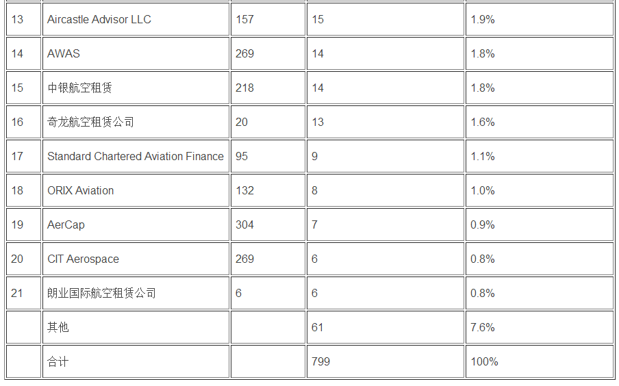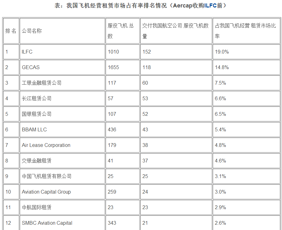 表:我国飞机经营租赁市场占有率排名情况(Aercap收购ILFC前)