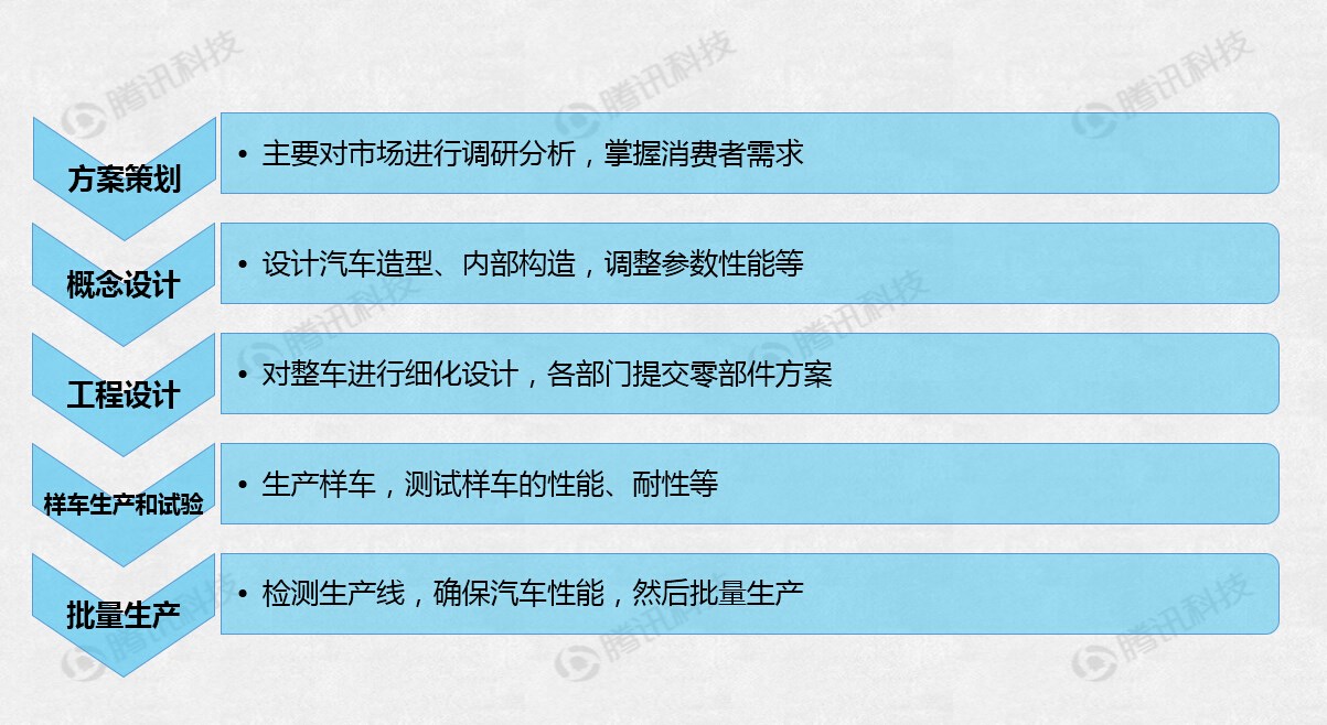 一般来说,汽车的设计、开发、生产流程,包括:方案策划、概念设计、工程设计、样车生产和试验、批量生产等五个阶段,如下图所示:
