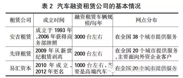 因早些年汽车融资租赁价格较高,且存在较多的限制条件,整体行业发展相对滞后,我国汽车租赁是市场渗透率(租赁汽车的数量占乘用车总保有量的比例)较发达国家市场明显偏低。目前,国内个人汽车融资租赁市场基本未开放,即使是公司车队,租赁渗透率也不到10%,且客户基本为外企;而在发达的成熟市场,每年近50%的车辆会以融资租赁形式出售。在新《汽车金融公司管理办法》出台后,许多融资租赁公司和相关机构开始积极寻求与外界的合作,专门的汽车融资租赁公司也日益增多。表2给出几个代表性汽车融资租赁公司的基本情况。