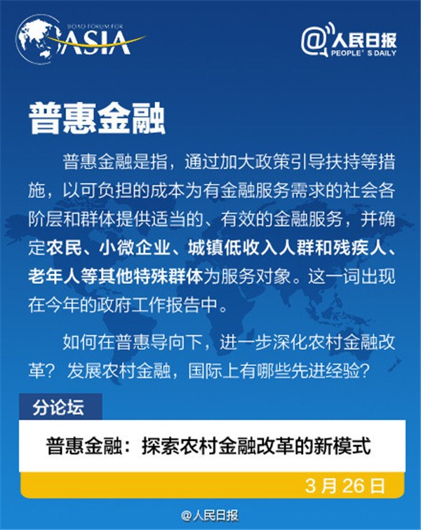 3月26日,博鳌亚洲论坛2015年年会在中国海南博鳌召开。77场正式讨论,将围绕食品安全、雾霾治理、人工智能、一带一路、区域合作等议题展开。普惠金融