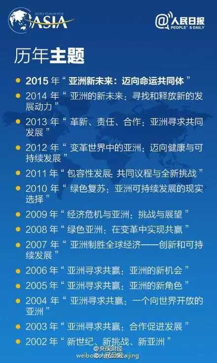 博鳌亚洲论坛2015年年会将于3月26日-29日在海南举行。作为一个立足于亚洲的经济论坛,博鳌覆盖的经济议题从未止步于地理上的边界,而且随着亚洲新兴