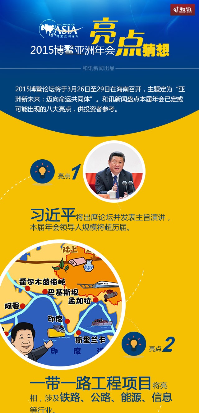 本月,西方国家陆续确认加入“亚投行”,博鳌论坛毫无疑问地将成为各国领导人进一步认识“亚投行”的最佳机会。同时,中国提出的“一带一路”建设构想将连接亚太和欧洲经济圈,涉及60多个国家的44亿人口,一批“一带一路”重大工程项目将这次论坛上亮相。