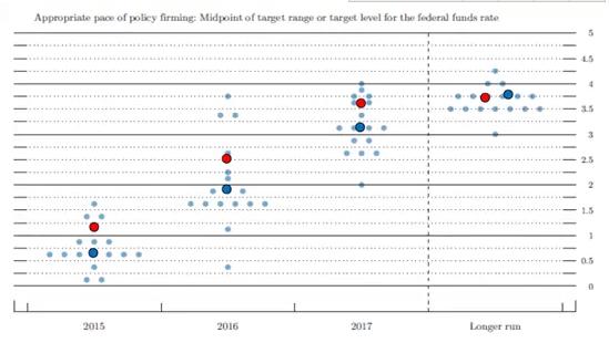 图2 美联储官员升息预期大幅下调(大红点代表12月预期中值,大蓝点代表3月预测中值)
