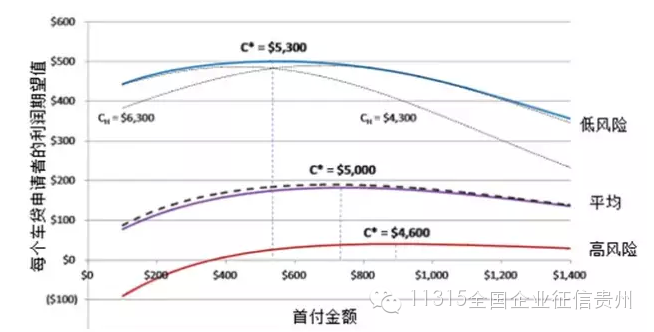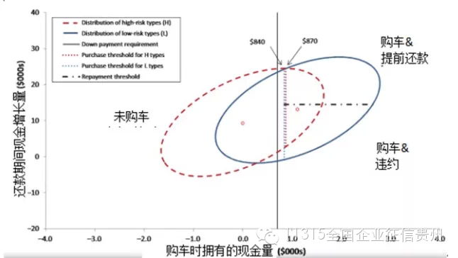 下面的案例来自于美国斯坦福大学的利兰middot;安纳夫(LiranEinav)等对一家专门为低收入高风险客户提供汽车贷款的公司的研究。由于这家公司的客户违约性高而回收残值低,因此商业利润的高低完全取决于对客户风险的认知。研究中使用的数据显示,这家公司的客户的平均家庭年收入为二万八千美元,仅列于当年全国水平的倒数33%位,其中三分之一的贷款申请者无银行账户,86%是租房户。而且超过一半的申请者在贷款前6个月至少有25%的债务逾期。如果没有对数据的挖掘,仅根据这些条件来看,这些客户的违约风险极高,得到信用贷款的可能性极小。传统的针对风险的信用贷方法是增加首付。但是,研究发现,对于每一百美元的首付费用的增加,申请贷款的可能性就降低2%—3%。而且逆向选择问题将使得车贷申请者的资质更次。