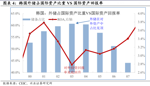 但从海外经验来看,对于新兴经济体来说,持有的储备资产似乎总要经历先增长后下降的过程。究其原因,这类经济体在发展初期并没有足够的资本积累来实现对外投资,因此通过出卖廉价的劳动力来完成这个积累过程是必要的一步。换句话说,中国在改革开放初期,中国只能“通过劳动力挣钱”,而随着资本的不断积累,“用资本挣钱”就逐渐变成顺理成章的选择。我们观察日韩数据,都可以观察到储备在国际资产中先升后降、同时对外投资收益先低后高的变化。从这个角度来说,坐拥近4万亿美元外储、1.8万亿对外净资产的中国,应该具备类似结构调整的条件。