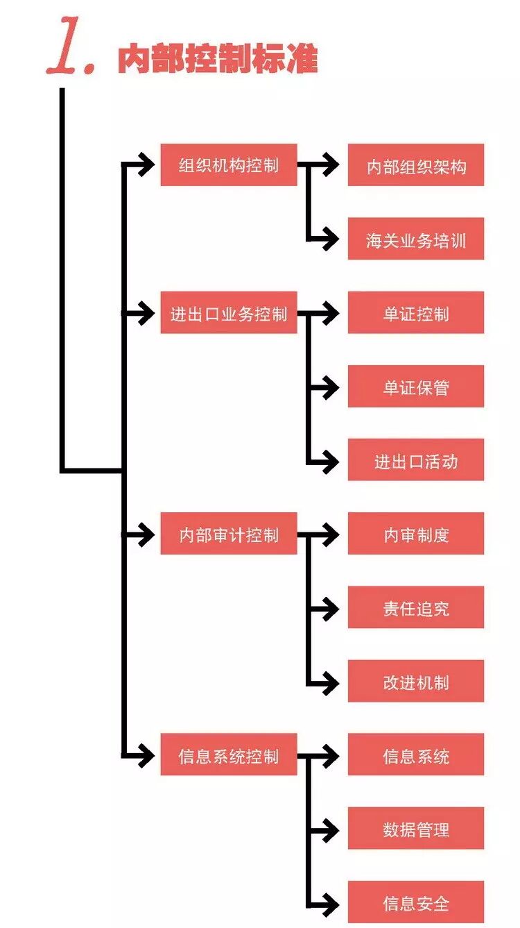 认证标准如何分类? 内部控制、财务状况、守法规范、贸易安全和附加标准,共5大类18条32项。其中前4类为基础标准,第5类为附加标准。 认证标准的通过条件有哪些? 企业同时符合下列两个条件并经海关认定的,通过认证: (一)所有赋分项目均没有不达标(-2分)情形; (二)认证标准总分在95分(含本数)以上。 认证标准总分=100+(所有赋分项目得分总和)。 申请前,如何自我评估? 企业向海关提出适用认证企业管理申请前,应当按照认证标准进行自我评估,并将自我评估报告随认证申请一并提交海关。 哪些规范允许改进? 除认证标准第12、13、14、15、17、22、23项外,其他项不达标或者部分达标的,允许企业规范改进。规范改进期限由海关确定,最长不超过90日。根据企业规范改进情况,海关认定其是否通过认证。 企业认证档案是否留存? 操作规范或者海关认证过程中明确需要企业提供相关材料的,企业应按要求提供书面或电子文档。 认证标准赋分规则 基础标准 赋分选项分为两种,一是“达标”、“不达标”,对应分值为“0”、“-2”;二是“达标”、“部分达标”、“不达标”,对应分值为“0”、“-1”、“-2”。 ◎达标 企业实际情况符合该项标准。该项标准中有分项标准(用“(1)”、“(2)”、“(3)”等表示)的,也应符合每个分项标准。 ◎部分达标 企业实际情况基本符合该项标准。该项标准中有分项标准(用“(1)”、“(2)”、“(3)”等表示)的,也应基本符合每个分项标准。 ◎不达标 企业实际情况不符合该项标准。 相关标准项不适用于该经营类别企业的,海关不再对该项标准进行认证。 附加标准 设定“符合”和“不适用”选项,对应分值为“2”和“0”。附加标准分值最高为“2”,不重复记分。