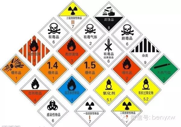 -----发货人在每项物品的包装箱上附有标签,包括对危险品的限制性条款。标签通过颜色、尺寸、图案等信息说明货物潜在的危险。主要分为如下几类: