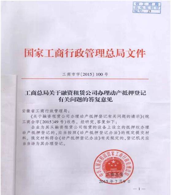 2015年7月9日,国家工商总局做出了《关于融资租赁公司办理动产抵押登记有关问题的答复意见》(以下简称“意见”),意见认为:企业为其从融资租赁公司租赁的设备上设立的抵押权办理动产抵押登记的,应当按照《动产抵押登记办法》的规定提交材料。提交材料符合《动产抵押登记办法》有关规定的,登记机关应当当场为其办理登记。