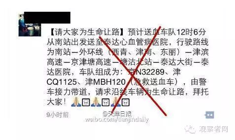 辟谣:此信息改编自前几天天津市转送从南京调来p型血救助先心病患儿。