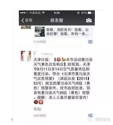 辟谣:有网友误以为,此次重污染天气黄色应急响应与爆炸有关。其实这是天津日报本月11日发布的消息,与此次爆炸事件并无关联。