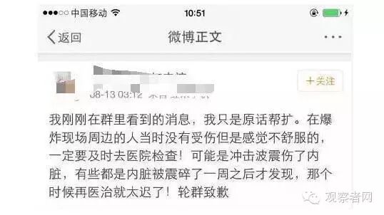 辟谣:认证信息为“前浙江援疆外科副主任医师”的微博认证账号@白衣山猫发微博辟谣称,“爆炸冲击波对人体伤害,是沿人体表片状冲击。人体表面最脆弱的是鼓膜。冲击波过后,你的耳朵不痛,听力无下降,你的内脏肯定不会受伤。暴力点状击打肝脾导致血肿,有剧烈腹痛者才有可能迟发破裂,需去医院。灾难当头,呼吁大家别信妖蛾子谣言,别恐慌,别去医院添乱”。
