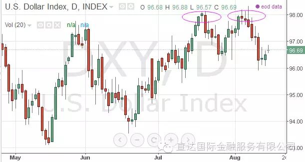 人民币风暴逐渐平息,本周金融市场将迎来美联储会议纪要和一系列的重磅美国经济数据,美元料将迎来关键时刻。周一(8月17日)欧市盘初,美元指数窄幅震荡于96.70附近,日线有构筑双顶的风险。不过,CFTC数据显示杠杆基金已连续第四周增持美元净多头仓位,创下1月13日来的最长增持纪录。包括法国巴黎银行在内的投行也重申耐心看多美元。