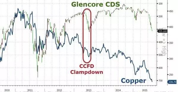 另外,观察下面这张图,铜价走势和嘉能可CDS价格走势水平镜像图有着有趣的联系。注意用红色圈圈标注的2013年期间的两者价格走势对比,请注意,如今的铜价跌幅高于当时。如果两者价格变动的有趣联系还有效,那么,这就意味着在不远的将来,嘉能可CDS价格继续上行的概率可能高于下行概率。