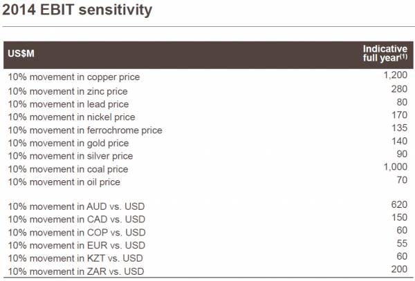嘉能可拥有极大的铜风险敞口。该公司在2013年的年度财报中表示,如果铜价下跌10%,那么公司的税息折旧及摊销前利润(EBITDA)就将被抹去12亿美元。