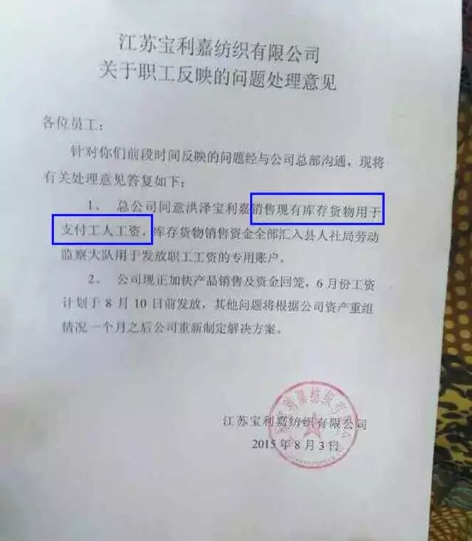 华东最大纺织大户-宝利嘉集团停产消息,引起行业一片哗然,唏嘘不已! 今日,据洪泽弘扬传媒消息:由于宝利嘉的破产倒闭,给政府和广大宝利嘉员工带来了很大的损失,现县政府将会以销售宝利嘉库存产品的方式来支付赔偿员工的损失! 由于宝利嘉的破产倒闭,给政府和广大宝利嘉员工带来了很大的损失,现县政府将会以销售宝利嘉库存产品的方式来支付赔偿员工的损失!6月份工资计划在8月10号前发放! 7月31日,宝利嘉董事长在公司邮件系统上发布了【通知,告社会各界和宝利嘉员工书】 该文讲诉了作为一个老总遇到的灾难性的打击,分厂招商政府承诺的信贷资金不到位,企业被耍,现金流短缺等经营问题。 可能实际情况中还有其他因素,但是这几年做实体的老板真心不容易。 告社会各界和宝利嘉员工书 宝利嘉的各位员工和社会各界的朋友们: 今天宝利嘉遇到了前所未有的灾难,让大家受苦了,受惊了。还有部分员工的工资和福利没有拿到手,也有社会各界朋友的借款没有还清楚,在这里本人表示真诚的道歉。以下是造成这些原因的基本情况和本人的看法: 1、自去年至今,宝利嘉集团被各家金融机构密集收贷,压贷计贰亿零柒佰伍拾万元整,设备租赁费壹亿多元,仅一年过程就减少了叁亿多元现金流。 2、六安、滁州两地开发区投资协议的重要款项没有兑现,其中六安经济技术开发区投资协议承诺为六安宝利嘉项目解决信贷资金4.2亿元,现已投资第七个年头,企业拿到的信贷资金仅为六安农商行的2000万元,仅仅是协议承诺的一个零头。也因此原因,造成宝利嘉六安公司开工率不足,造成年年亏损,也无法兑现对开发区的协议税收约定。滁州开发区也承诺解决信贷资金每完成一个车间6000万元,去年已完成4个车间的投产,应为企业解决信贷资金2.4亿元,实际现在也只有滁州中行的1000万元贷款,本来滁州工行的2000万元贷款也已由今年的6月18号全部收贷。 3、为维持企业生计,本人努力向社会人脉圈私人借贷7300万元,到现在资源也全部枯萎,还背负一身债务。 4、金融机构无节制的收贷、压贷,造成企业开工率严重不足,亏损严重,直至今天无力维计。 5、目前六安公司仓储物资足够发放员工工资福利,滁州库存偏少,需依靠政府来解决问题。洪泽、太仓也需要政府来解决部分问题,由此给员工们和社会各界带来的麻烦请多多谅解包涵。 6、本人也希望各界金融机构能体谅企业的疾苦,顾全大局,不要无节制的收贷、压贷,伤害人家也等于伤害自己,最后两败俱伤。也希望各地开发区能诚信招商,不能企业来投资了就什么都不管了,所有的责任都放在企业身上。一个宝利嘉倒下去并不可怕,如果很多企业都遇到了宝利嘉同样的命运,将对社会稳定将带来巨大影响。 7、因我本人原因害了大家对宝利嘉失去信心了,我希望员工们和社会各界不要灰心,也不要担心,就算我没能力在经营这个企业了,我相信未来的宝利嘉会有能力更好的老板来经营好这个企业,因本人掌控企业能力不够,造成宝利嘉变故给社会各界朋友和员工带来的麻烦和困惑表示深深歉意! 希望大家在炎热的夏天里,消消气,好好休息,等待好消息。如果有幸还能和大家在一起,我会加倍努力的去工作,同时也希望大家能继续支持我。 我相信政府能协调和处理好眼前的这些问题,最后祝大家平平安安,顺顺利利! 宝利嘉 葛富春 2015-7-31 每位员工都应感谢你的老板,尤其是行业整体不佳的这两年。你也许永不知道,你玩着手机开小差的时候,你的老板正在焦头烂额;你也许永不知道,你盘算该拿多少薪水的时候,你的老板正在下一张借条上签名。中国的民企老板,解决了中国80%以上的就业人口。但中国的民企老板,80%以上面临着企业倒闭风险、法律风险。台风覆船的时候,最倒霉的一定是船长自己——船员可以逃命,但船长却舍不得他那条船! 请照顾好你的老板,他真的不容易!!