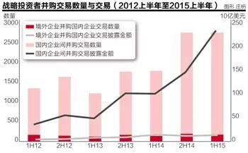 晨哨研究部提供的2015年二季度中国企业海外并购交易宗数为 128 宗,环比增长 7.56%,同比增长 72.97%;披露交易金额约为325.48 亿美元,环比减少约18.78%,同比增长61.93%。就交易类型来看,该季度股权并购依然占据主要地位,涉及金额约为116.45亿美元,占交易总金额的87.87%。