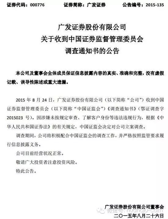 在公安部严打地下钱庄的同时,证件会也开始行动。据中新网报道,8月25日,广发证券、海通证券、方正证券、华泰证券四家券商公司先后发布公告称,公司于8月24日收到中国证监会《调查通知书》,因公司涉嫌未按规定审查、了解客户身份等违法违规行为,根据《中华人民共和国证券法》的有关规定,中国证监会决定对公司进行立案调查。