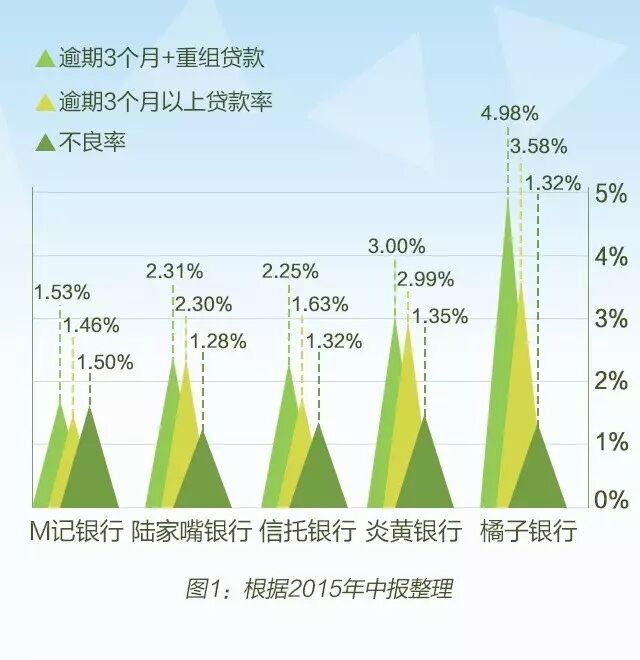 而且,只看逾期3个月以上还不够,笔者发现,逾期3个月以上贷款率高的,通常还有一个指标也比较高,那就是重组贷款率。已经公布中报的几家银行的重组贷款率,橘子银行1.40%、炎黄银行0.01%、信托银行0.62%、陆家嘴银行0.01%、M记银行0.07%。把这个指标加上逾期3个月以上贷款率指标,更能说明问题。