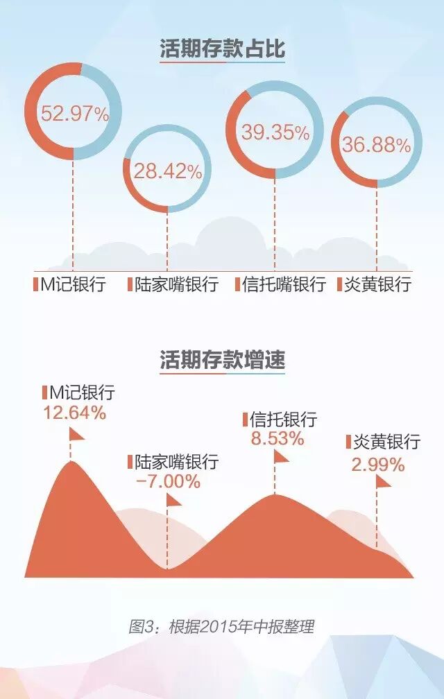 特别要指出的是,M记银行这里列出的非息收入占比不是财报披露数值,而是按照可比口径,根据其往期的非息收入结构测算所得。长期细心跟踪银行股的同学才会发现,今年中报M记披露口径的非息收入已经剔除了信用卡分期收入,而其他银行披露的则仍然包含分期收入。与前面M记银行充分暴露不良但逾期3个月以上贷款率反而最低类似,其对非息收入的核算也是底气十足,颇有点“春色满园关不住”的感觉,未来其非息收入达到半壁江山可能并不需要多久。其实M记不仅非息收入占比很高,其活期存款占比也很高,并且快速增长。注意,现在的活期存款可不是拉来的啊,那都是其他业务结算留存的。非息收入占比较高,是应对经济转型期不良加速爆发和金融脱媒的最大本钱,活期存款占比较高,则说明在利率市场化的最后冲刺中已经跑在前列了。