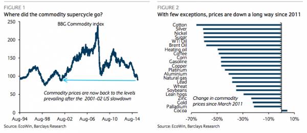 如今,彭博大宗商品指数已经跌至2002年低位(figure 1),本轮“大宗商品超级周期”以来积累的全部涨幅几乎蒸发殆尽。