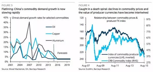 首先就是中国经济放缓和经济增长模式转型,这导致全球大宗商品需求增速大幅放缓。过去五年中,中国对石油、铜和铝需求的平均增速为6%,9%和13%。巴克莱预计未来五年内将分别跌至3%,2.4%和2.5%(Figure 3)。
