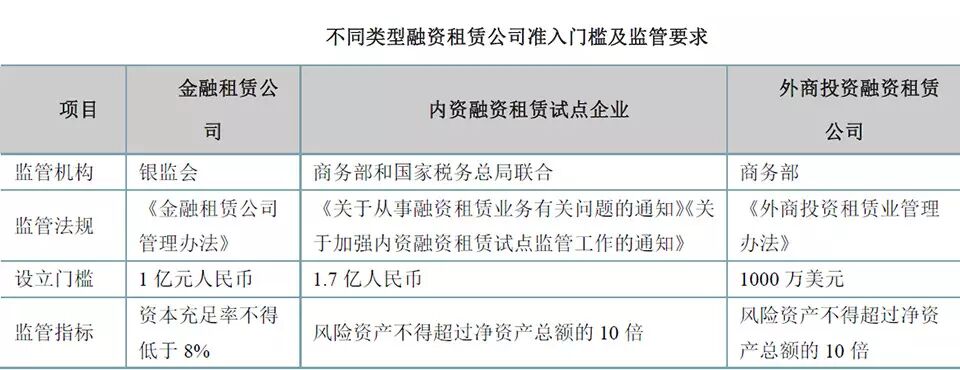 根据对租赁公司的监管机构不同,中国融资租赁公司分成三类:其中金融租赁公司归银监会监管,外资融资租赁公司和内资融资租赁公司归商务部监管。看下图。