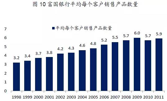 对于个人,社区银行提供了储蓄、信用卡、住房抵押贷款、财富管理、保险等多项业务,对大中型企业,批发银行提供了商业贷款、房地产开发贷款、投资银行、投资管理、企业年金、贸易融资、信用证等多项业务。1998年来,银行平均向每个客户销售的金融产品数量持续增长,在2009年接近6个,虽然2010年受收购美联银行并表的影响,这一数据减少为5.7个,但仍然保持着上升的态势。