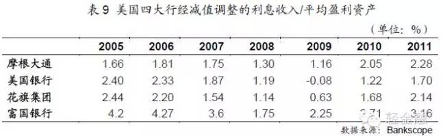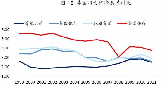 如前所述,就利息收入来说,净利差是衡量这一利润的重要指标,对比国内四大行和富国银行的净息差,可以说,国内银行的息差即使在未来利率市场化的条件下,仍有可能取得较高的水平。