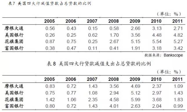 经营小微企业信贷、住房抵押贷款业务必然要面对很大的风险暴露,在高利息的同时,如果稍有疏忽,随之而来的就可能是高企的坏账率,吞噬银行的利润,产生巨大的损失,然而富国银行的坏账率却低于其他银行,显示出很强的风险管理能力。以下是美国四大银行在金融危机前后的不良贷款情况,从表中可以看出,富国银行的减值贷款和贷款减值支出占总贷款的比例一直处于较低的水平,对比它在小微企业和住房贷款领域面对的风险,达到这样的坏账率可谓十分难得。