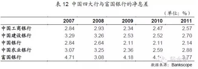 中国四大银行的高利润一直为人诟病,在利率市场化逐渐开启的今天,人们普遍的四大行未来的盈利能力感到悲观,认为四大行现有的盈利水平难以为继。那么,对比在利率市场化环境下经营的富国银行,四大行的盈利水平真的没有增长空间了么?答案显然是否定的。