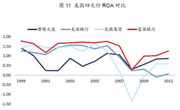 前面我们提到,富国银行一直保持着较高的盈利能力,那么,对比其他银行,富国银行的盈利水平是否占优呢?以下是富国银行和美国其他三家大行(摩根大通、花旗集团、美国银行)的盈利数据对比,选取的指标是他们的总资产利润率(ROA)和权益净利率(ROE)。
