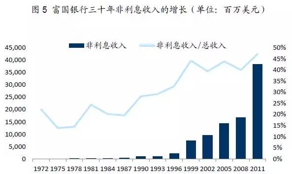 除去高净息差带来的大笔利息收入之外,迅速增长的非利息收入也是富国银行得以维持较高水平的重要因素。自利率市场化之后,富国银行就开始大力发展中间业务,提升非利息收入的比重,非利息收入占总收入的比重由1987年利率市场化完成时的20%左右,提高到现在的接近50%,有了快速的增长。