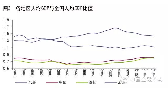 从人均GDP看,东部和东北地区超过全国水平,中、西部地区人均GDP低于全国水平。观察各地区人均GDP与全国平均水平之比,东部地区从1982年的1.31逐渐升至最高点2005年的1.67,之后逐渐下降至2014年的1.44;中部和西部地区先降后升,均在1994年降至最低点0.63和0.61,之后逐渐上升,至2014年分别达到0.82和0.81;东北地区总体下行,从1982年的1.43逐渐下行,在1991年被东部地区超过,之后下降至2014年的1.12。从人均GDP的规模看,东部地区最大,其次是东北地区,然后是中部地区,西部地区最小。