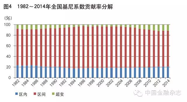 从基尼系数贡献率分解看,区域间经济差距对中国整体经济发展差距的贡献最大,约占70%,其中最大年份是1996年,达到79.3%,最小年份是2012年的67.2%。区域内经济差距对中国整体经济发展差距的贡献约占20%,其中最大年份是1982年的23.7%,最小年份是1994年的17.7%。区域间超变强度对整体经济发展差距的贡献最小,约占10%,最大年份是2012年的11.8%,最小年份是1999年的2.9%,且在2000年前超变强度贡献不断减小,说明区域间经济差距存在明显的分界,即贫穷地区中富裕省份所占比例很小,但2007年之后超变强度贡献明显增加,说明贫穷地区中富裕省份所占比例上升,仅通过地理位置划分经济区域的合理性受到挑战。